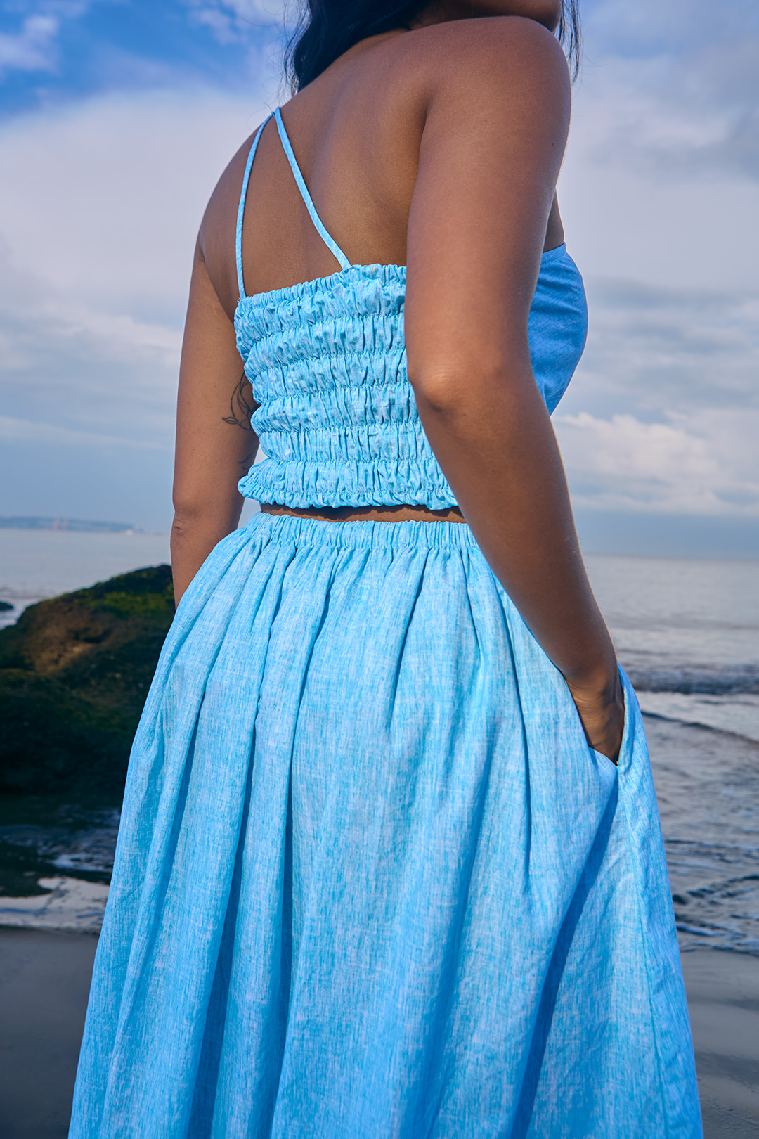 Design Details: Gathered skirt with side pockets
