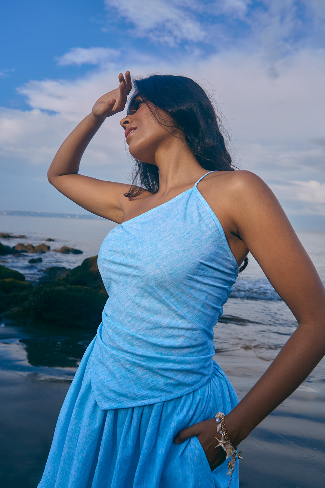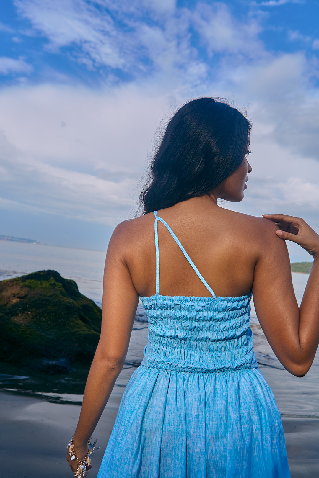 Sky blue brushed poplin cotton, an asymmetric neckline, thin straps and smocked back detailing.