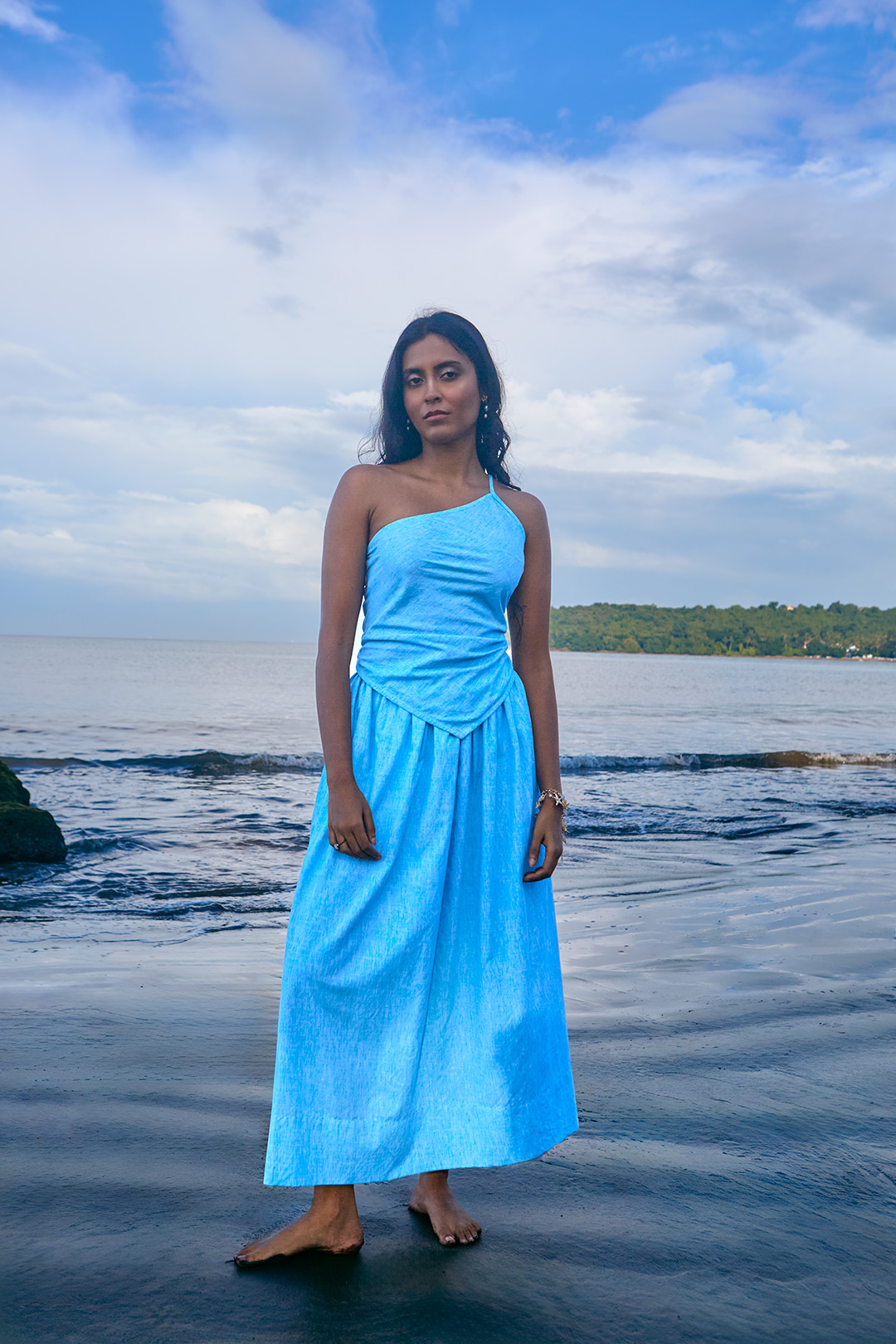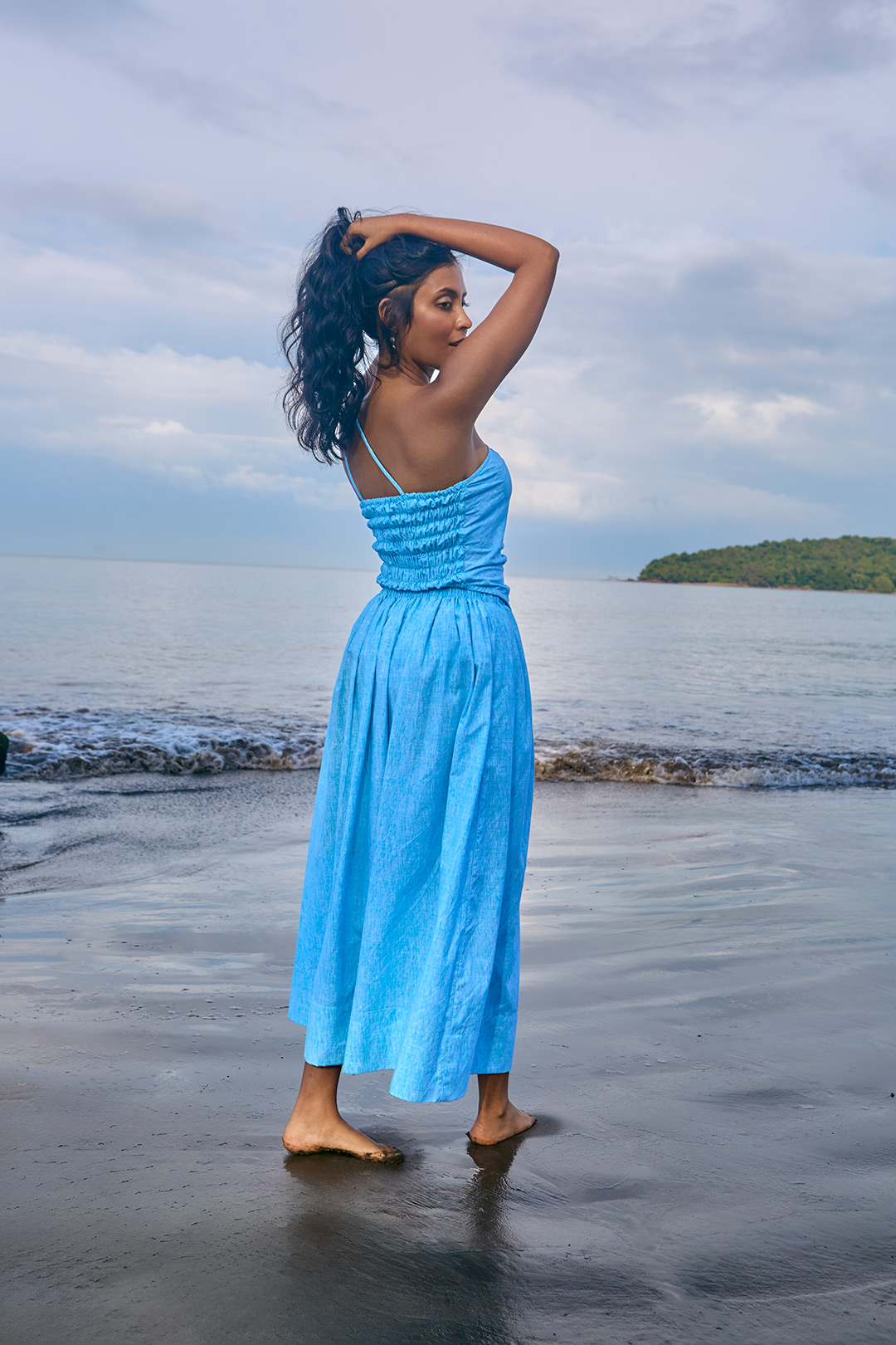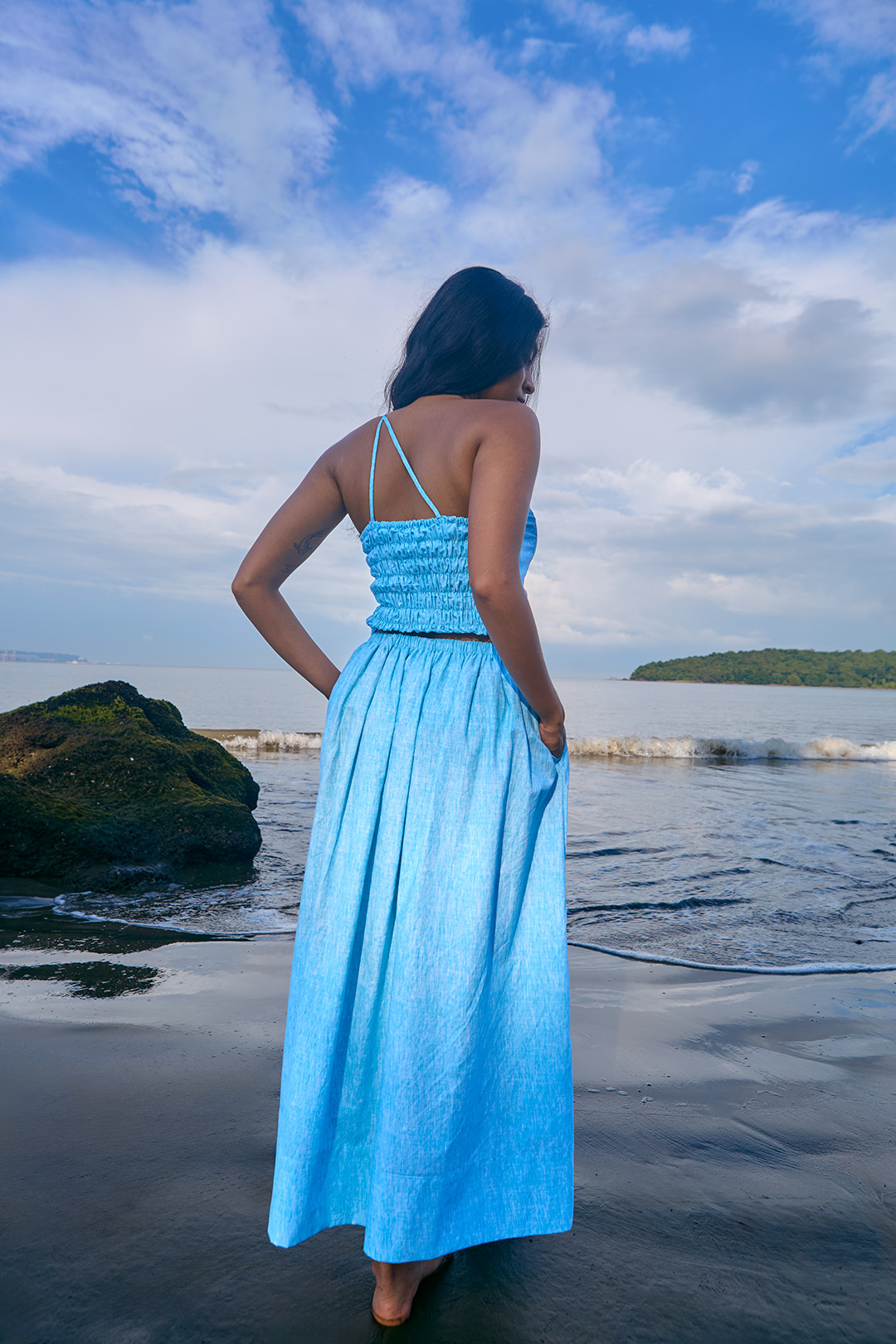 Sky blue brushed poplin cotton twinset featuring an asymmetric smocked top and a gathered midi skirt with elastic waistband and side pockets.