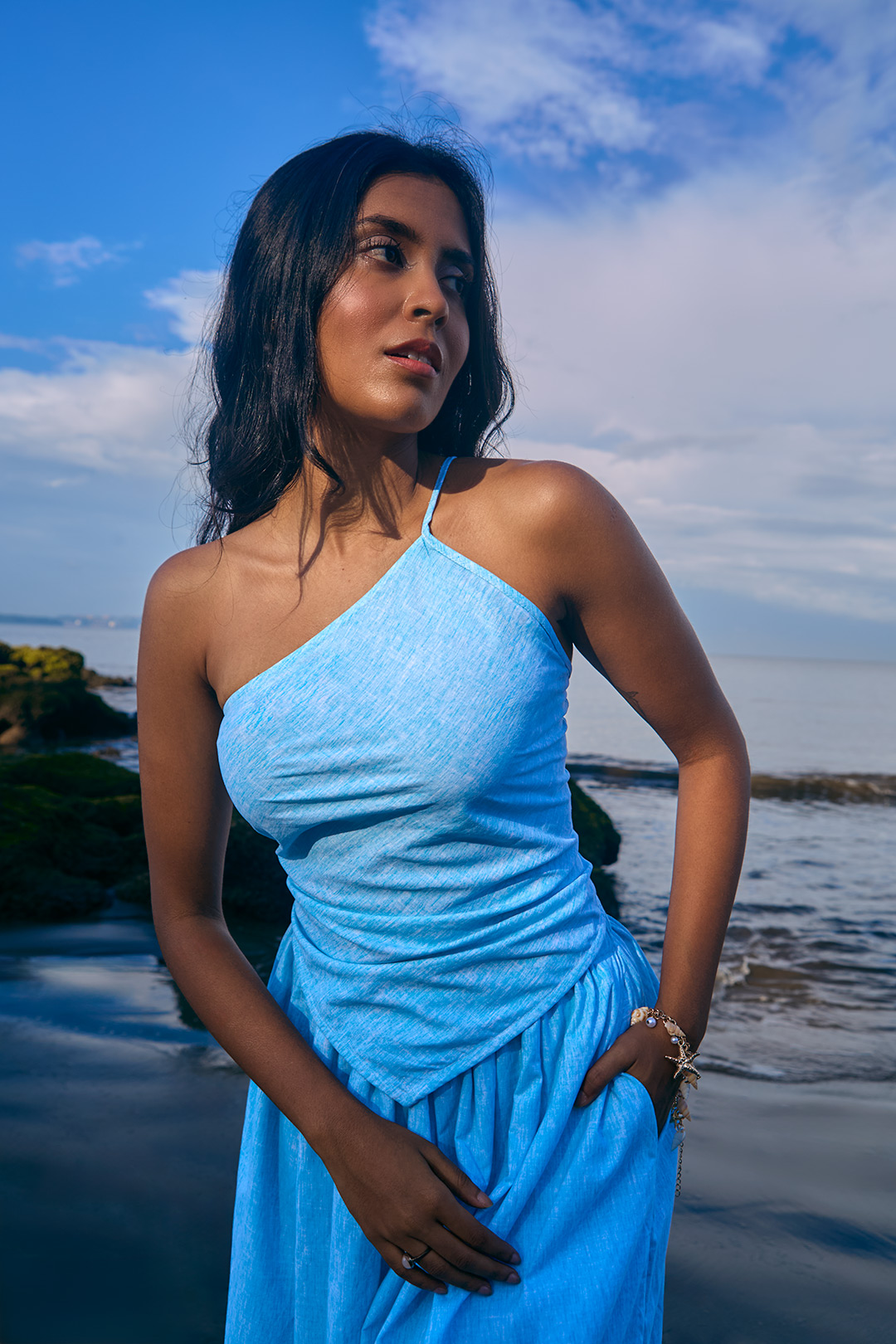 Top Details: Asymmetric neckline, thin straps, smocked back