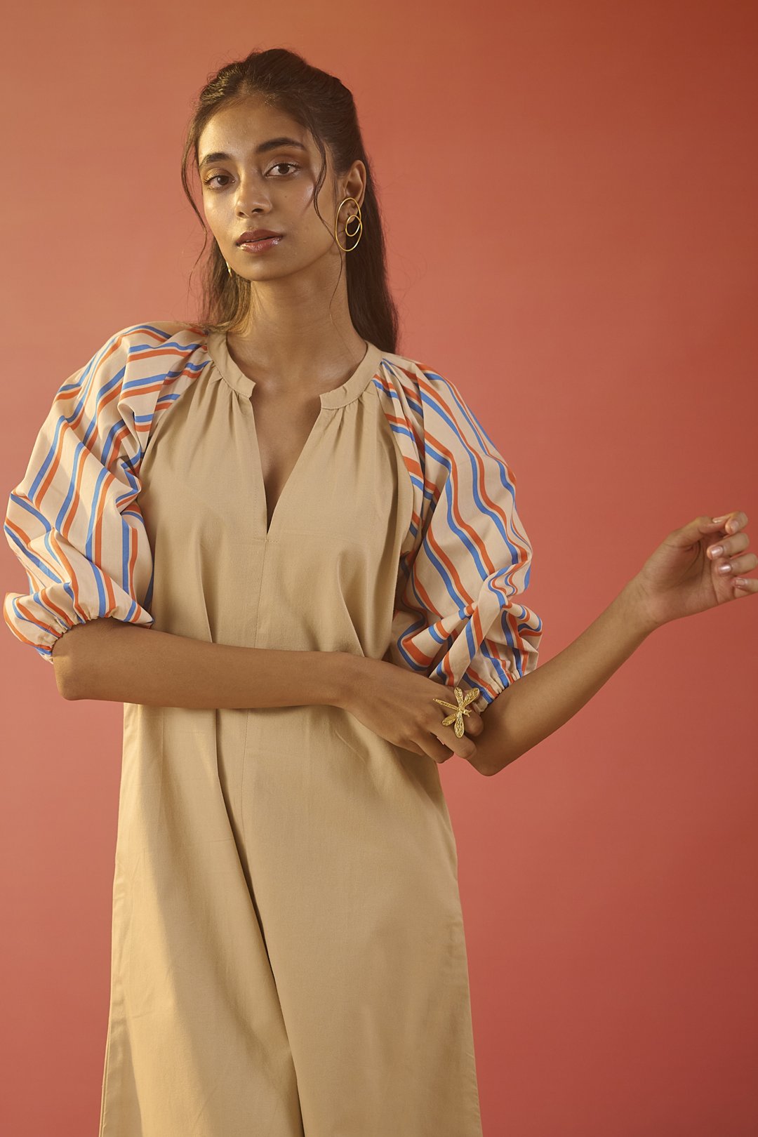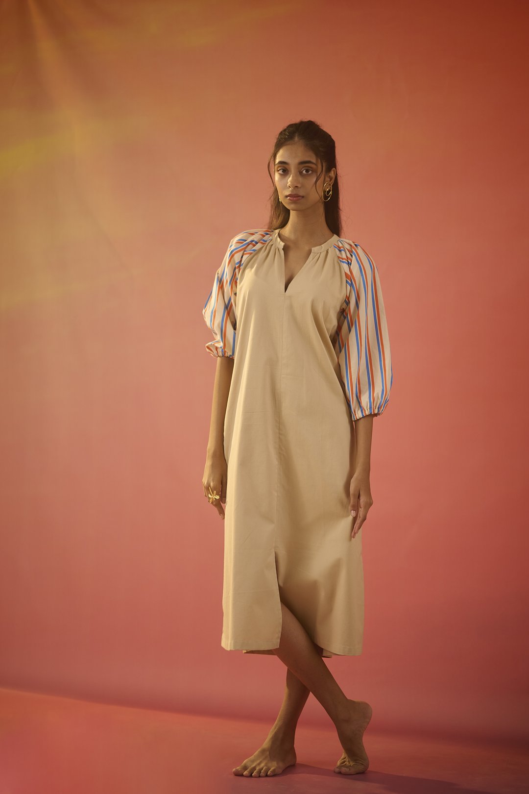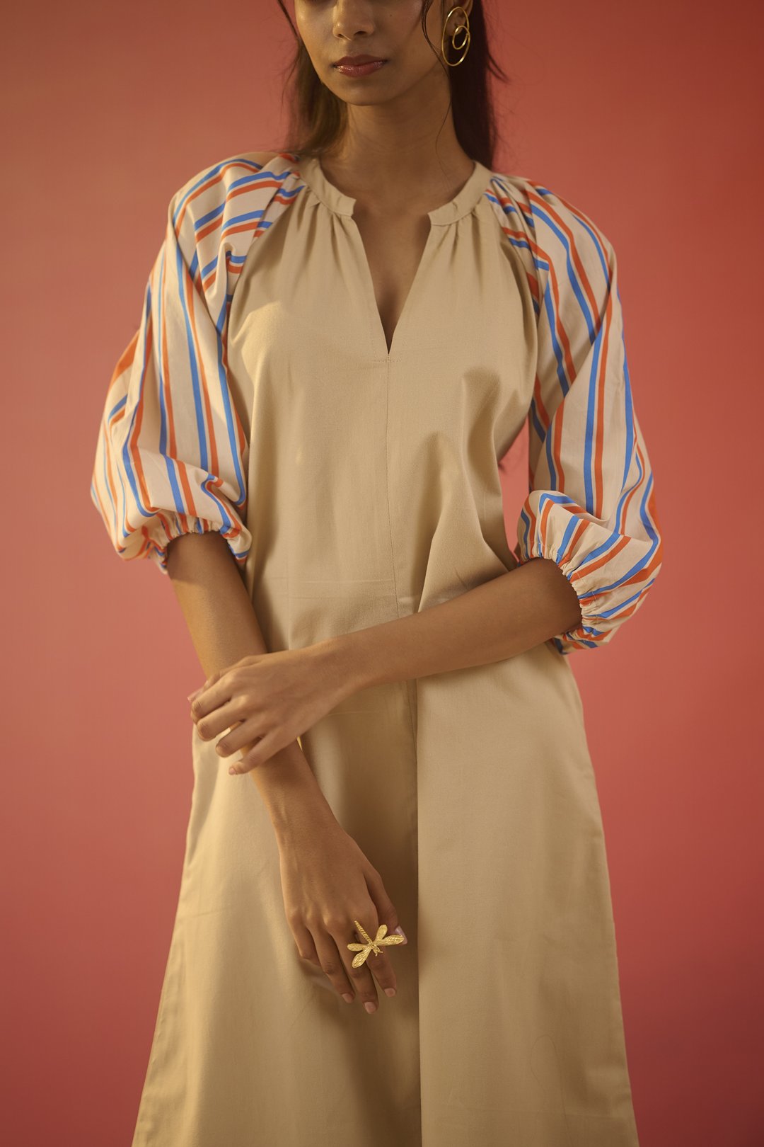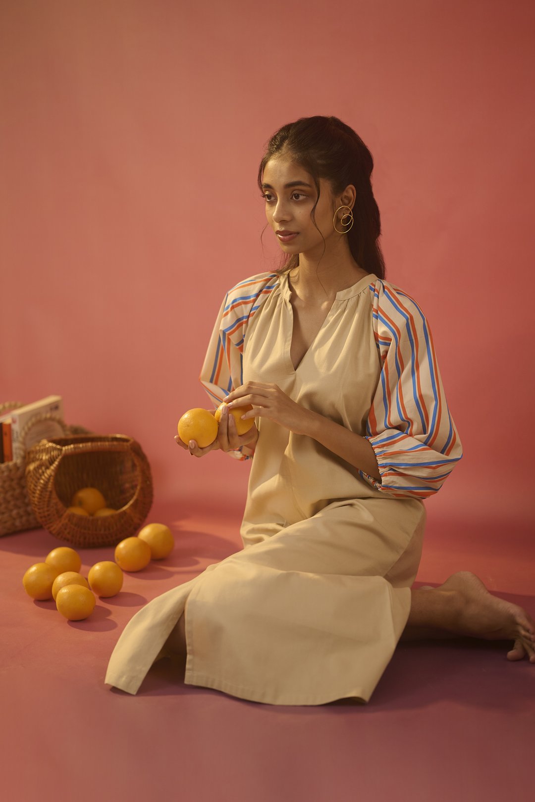 The Citrus Cream Midi Dress captures the fresh zest of sunny mornings and vibrant markets. With a relaxed, breezy silhouette, this midi dress features a warm, earthy beige tone complemented with bold striped sleeves in citrus-inspired hues. The V-neckline and loose fit make it comfortable, while the billowing sleeves add a touch of whimsy and fun. Ideal for brunches, picnics, or any day you want to bring a little sunshine to your style, this dress is as refreshing as the summer breeze.