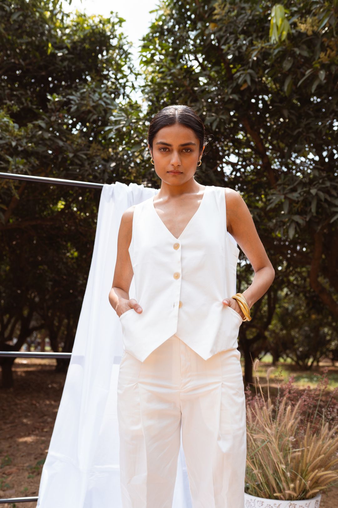Ecru waistcoat with a buttoned front, designed with a V-neckline and sleeveless silhouette.