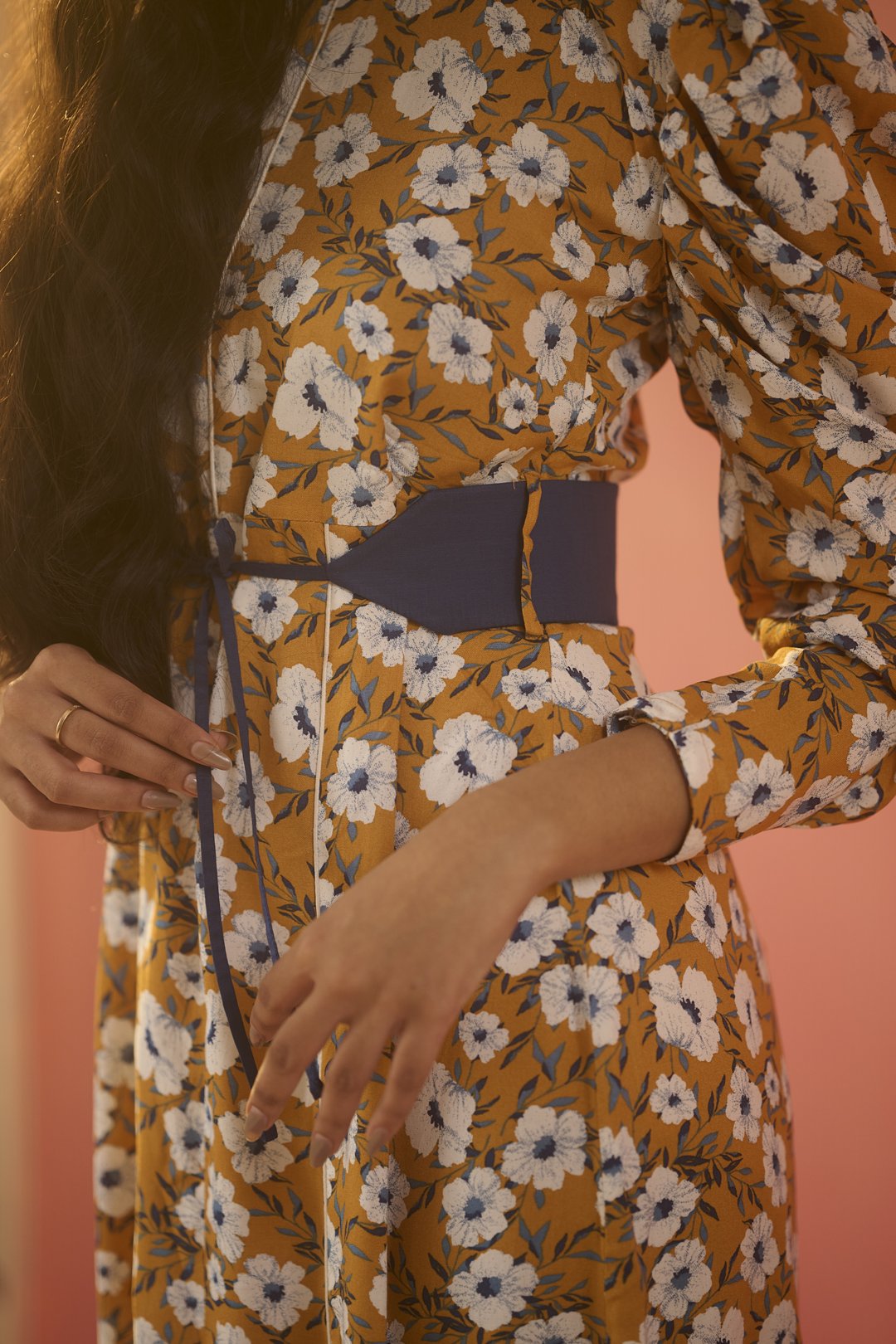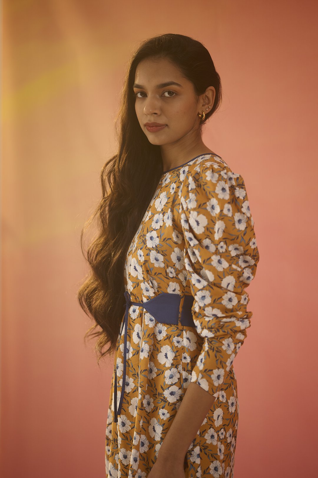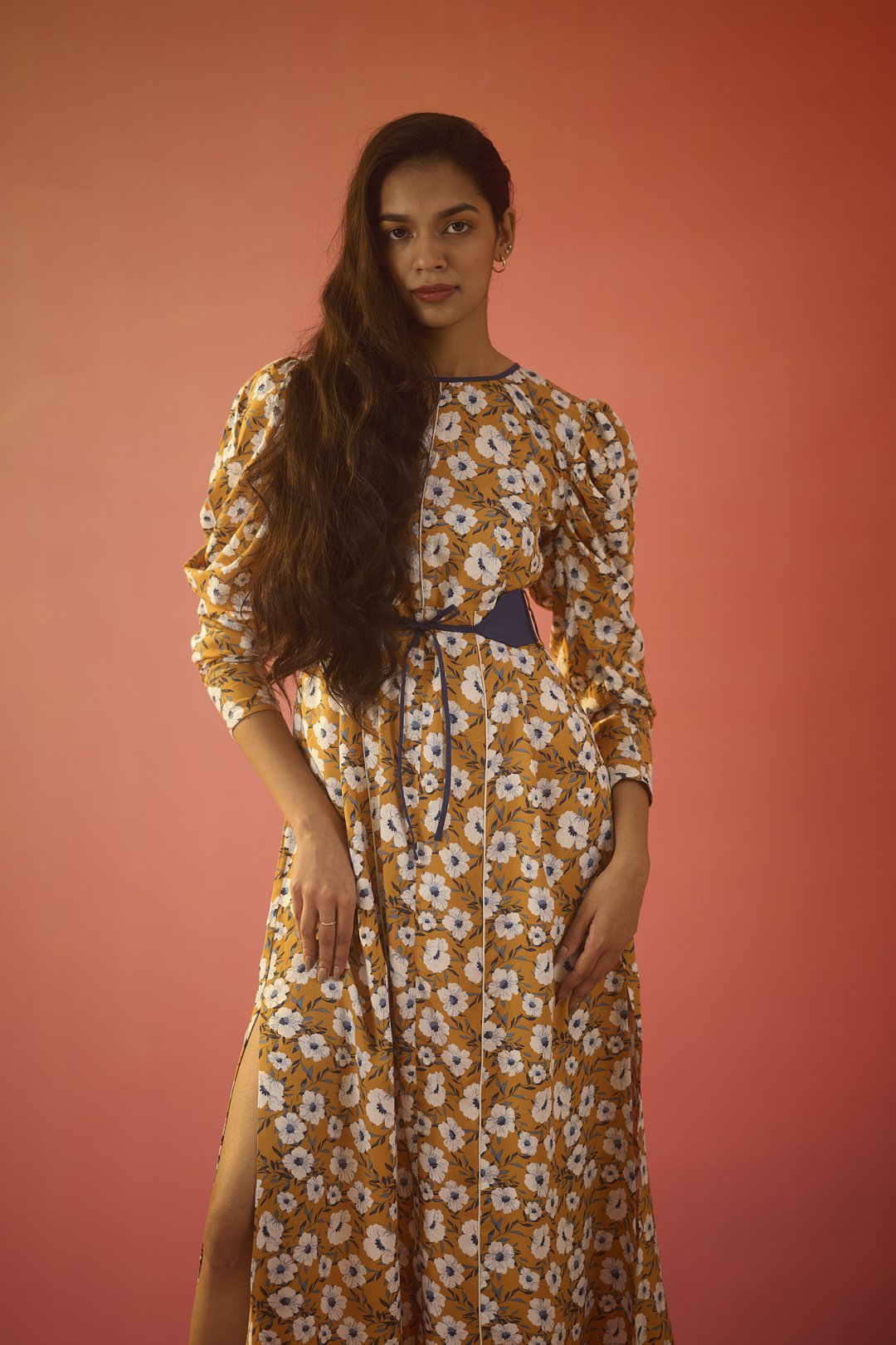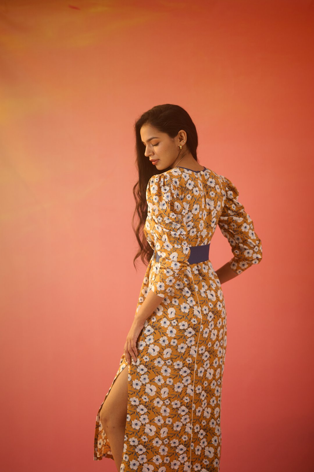Brighten up your day with this stunning mustard floral midi dress, blending classic charm with a modern twist. The straight fit offers an elegant silhouette, while dramatic voluminous sleeves add a touch of flair. A vibrant blue tie-up belt cinches at the waist, creating a flattering shape and adding an unexpected splash of colour. From brunch dates to evening soirées, this dress transitions effortlessly for any occasion.