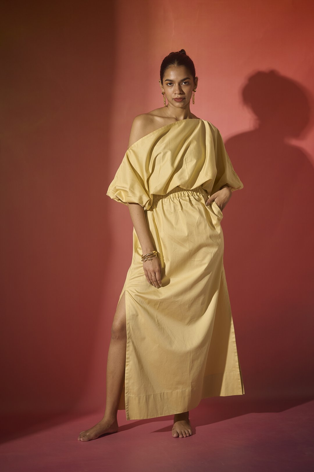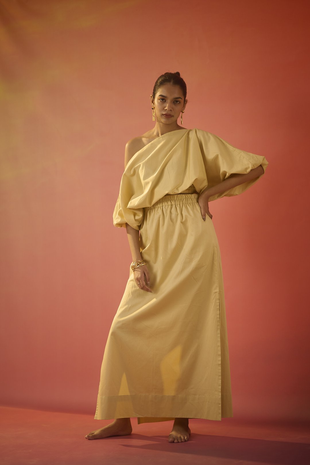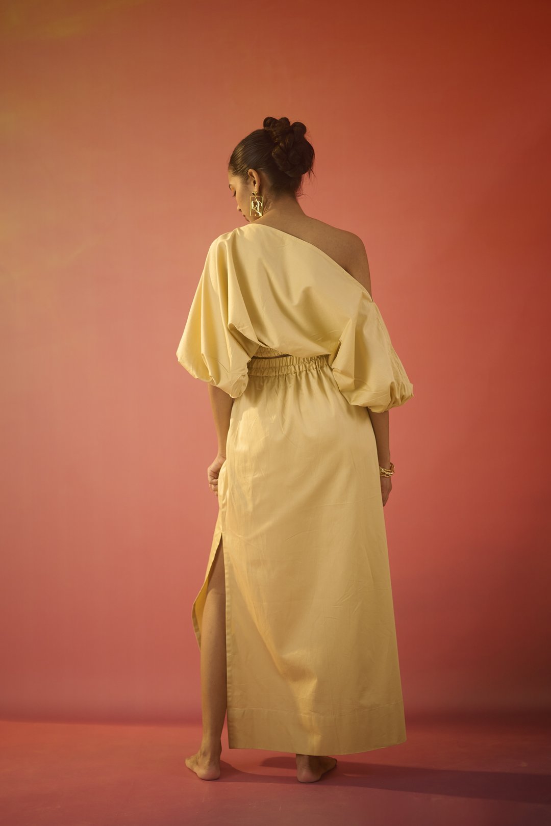 A golden yellow sateen maxi skirt featuring an elasticated waistband with subtle side slits.