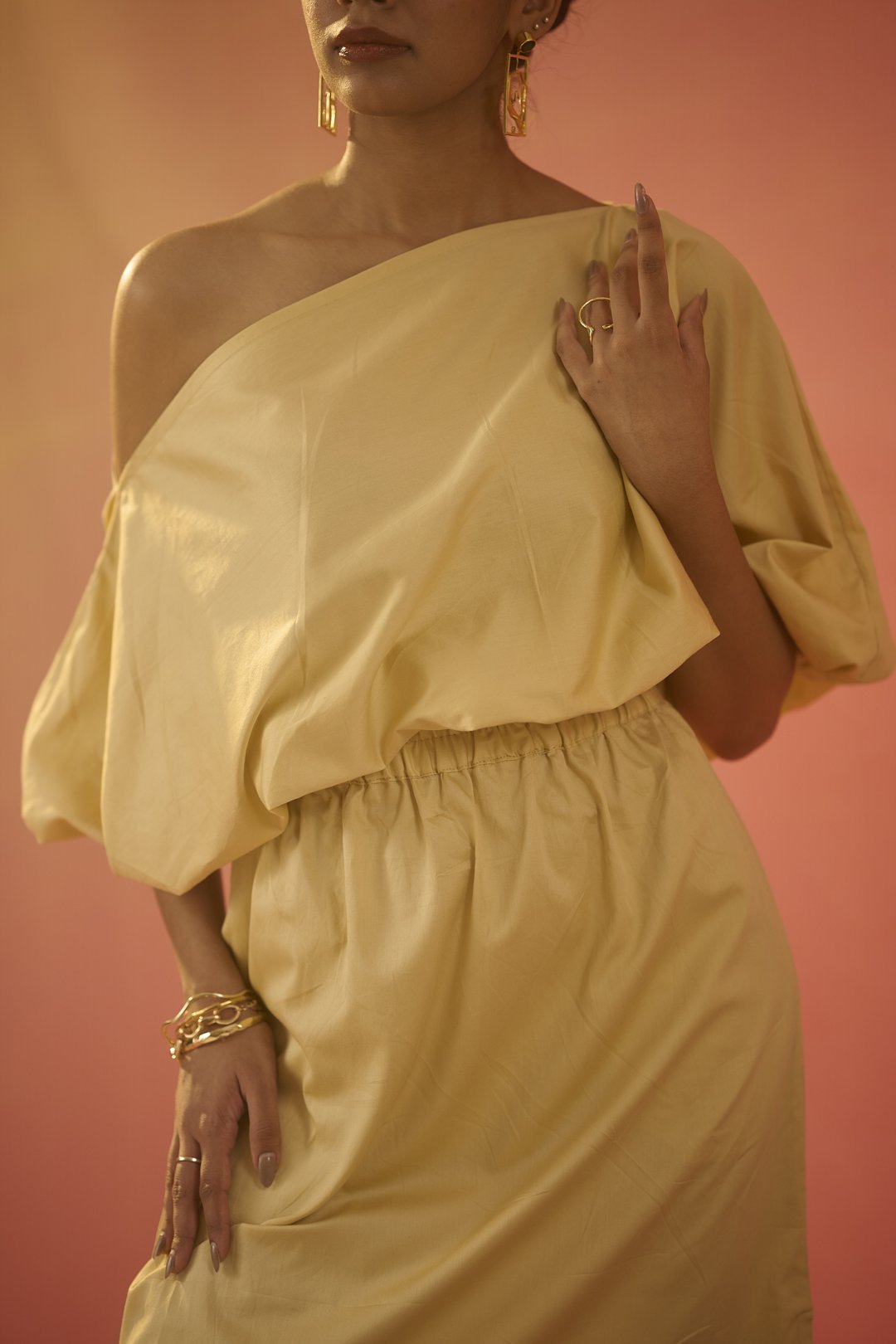 Golden yellow sateen cotton off-shoulder top featuring elasticated sleeves, and waistband.