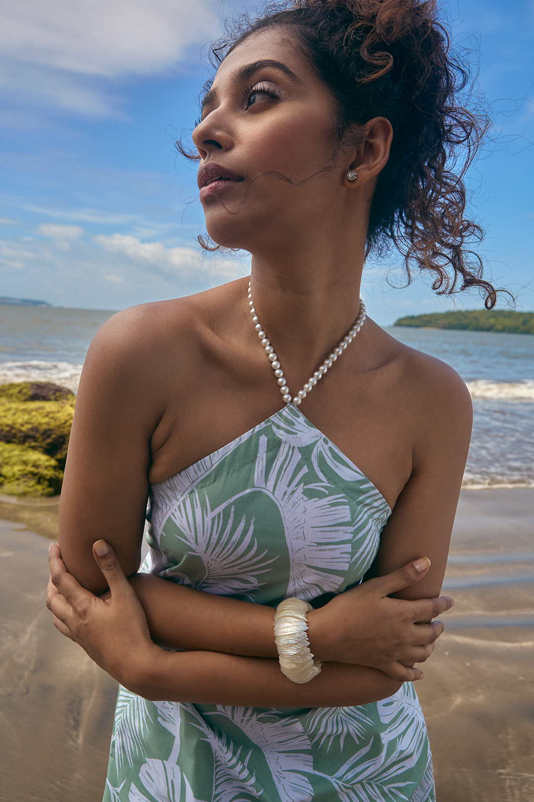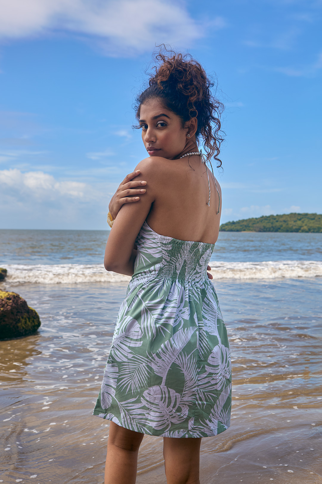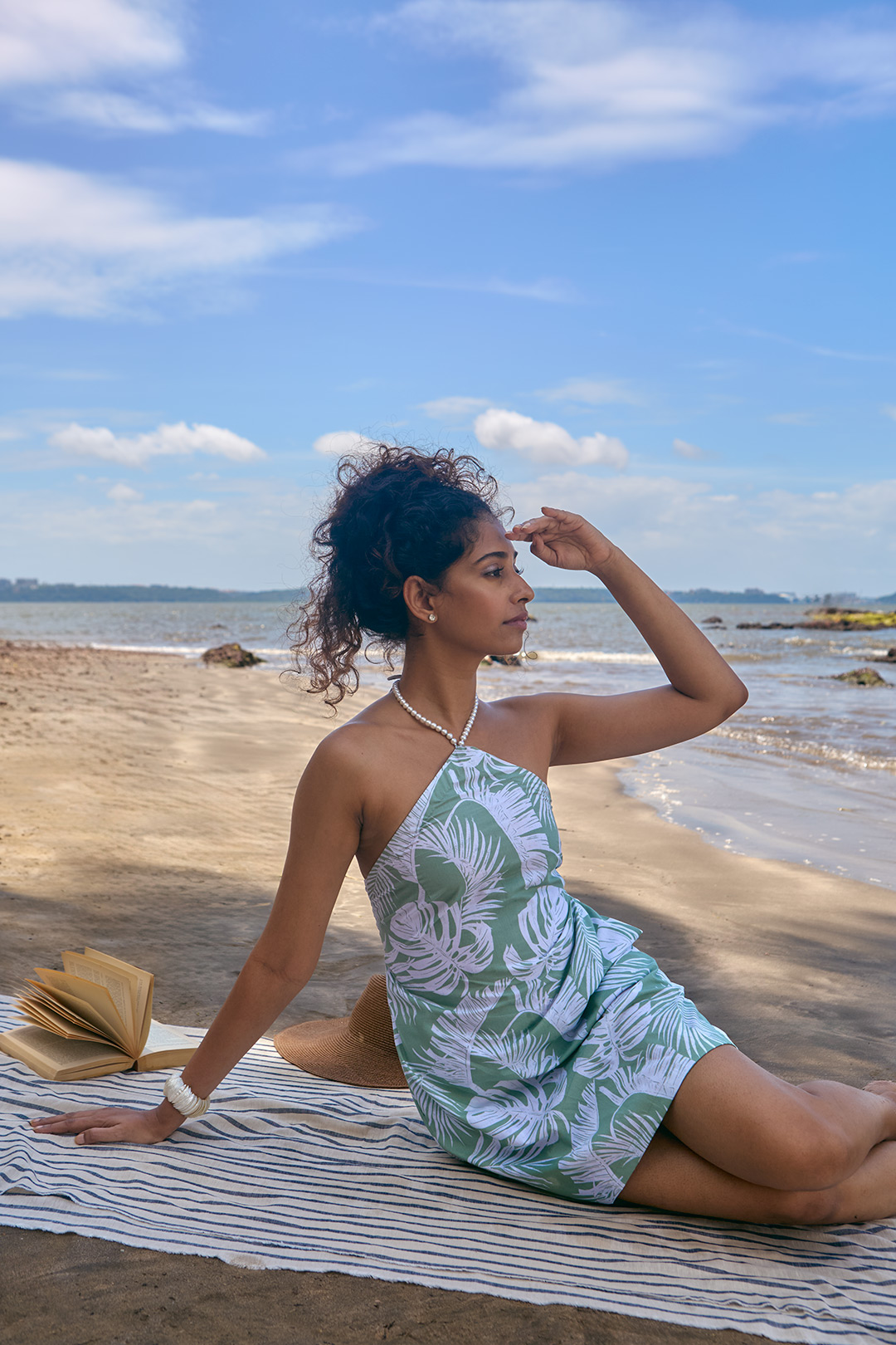 Sage green printed poplin cotton mini dress with white leaf motifs, halter neckline with back pearl beads tie-up