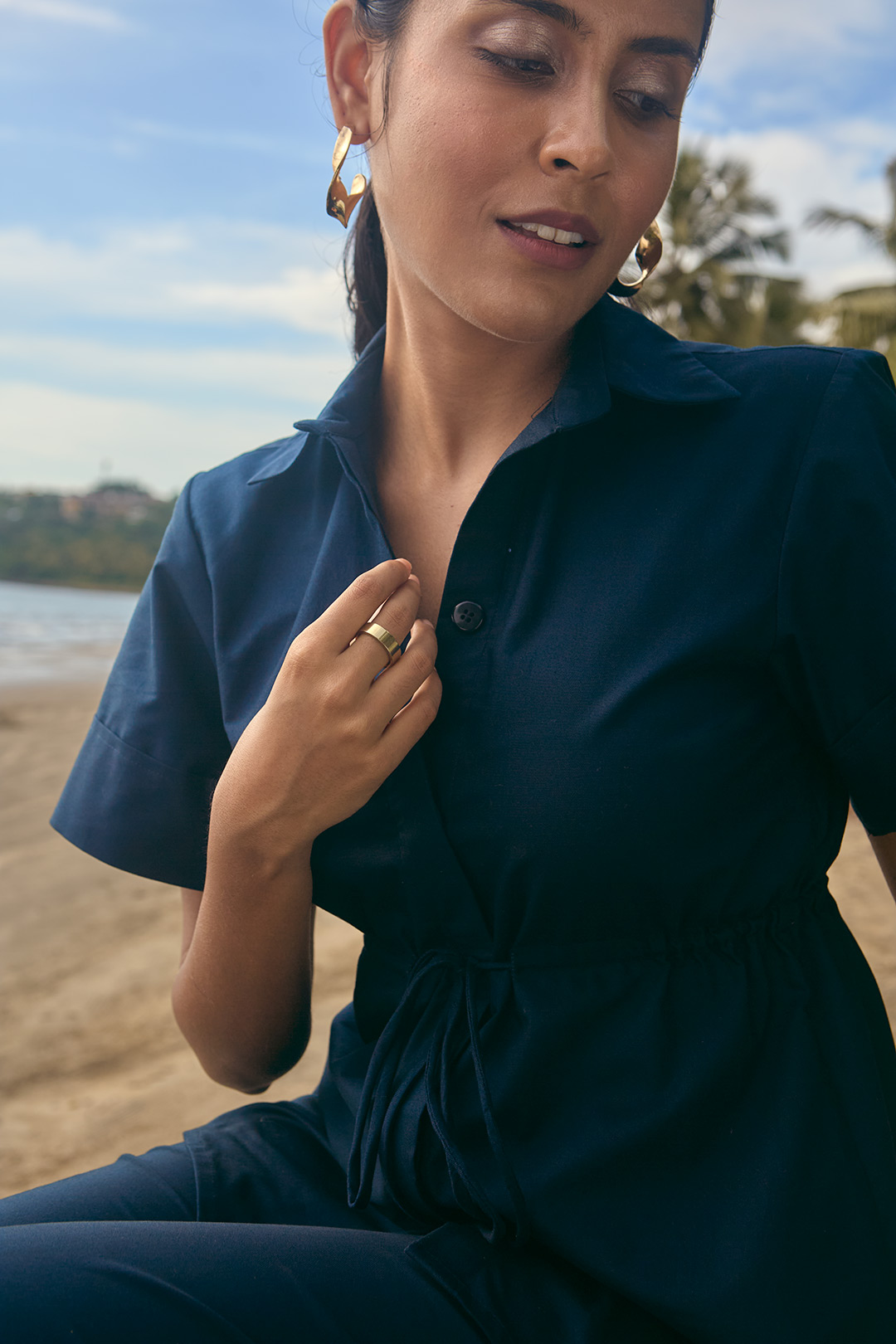Deep navy cotton shirt with short sleeves, spread collar, and adjustable drawstring waist for a cinched fit.