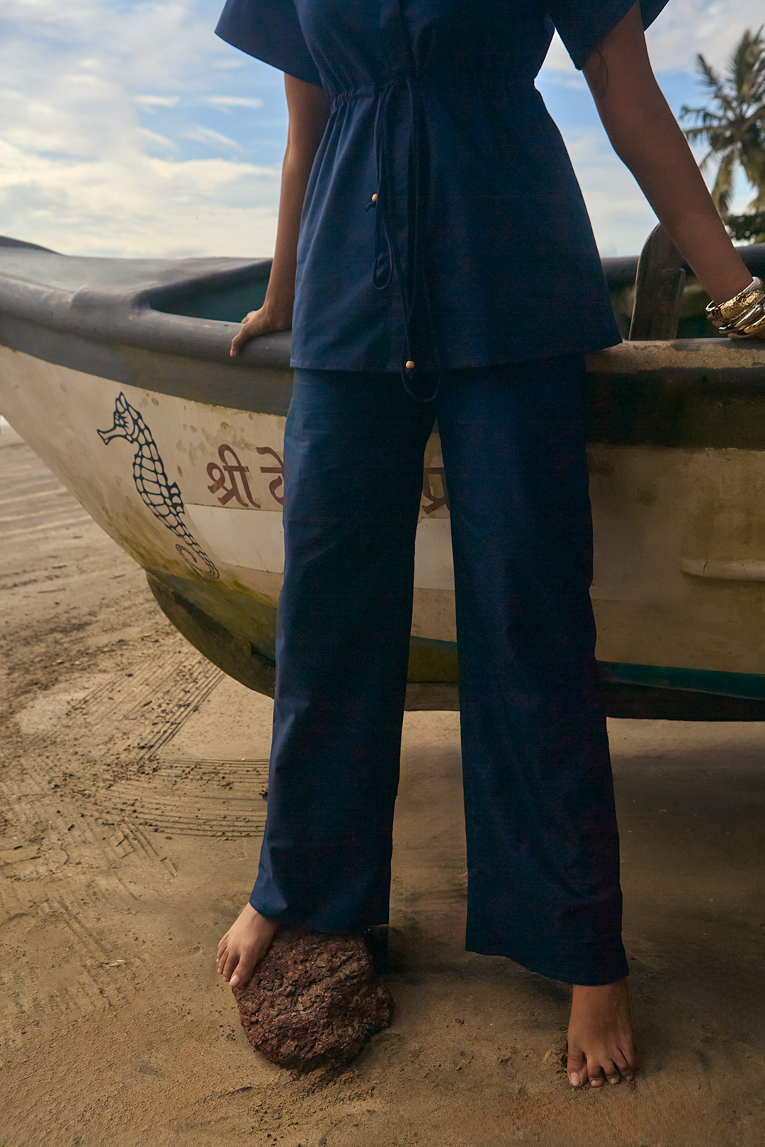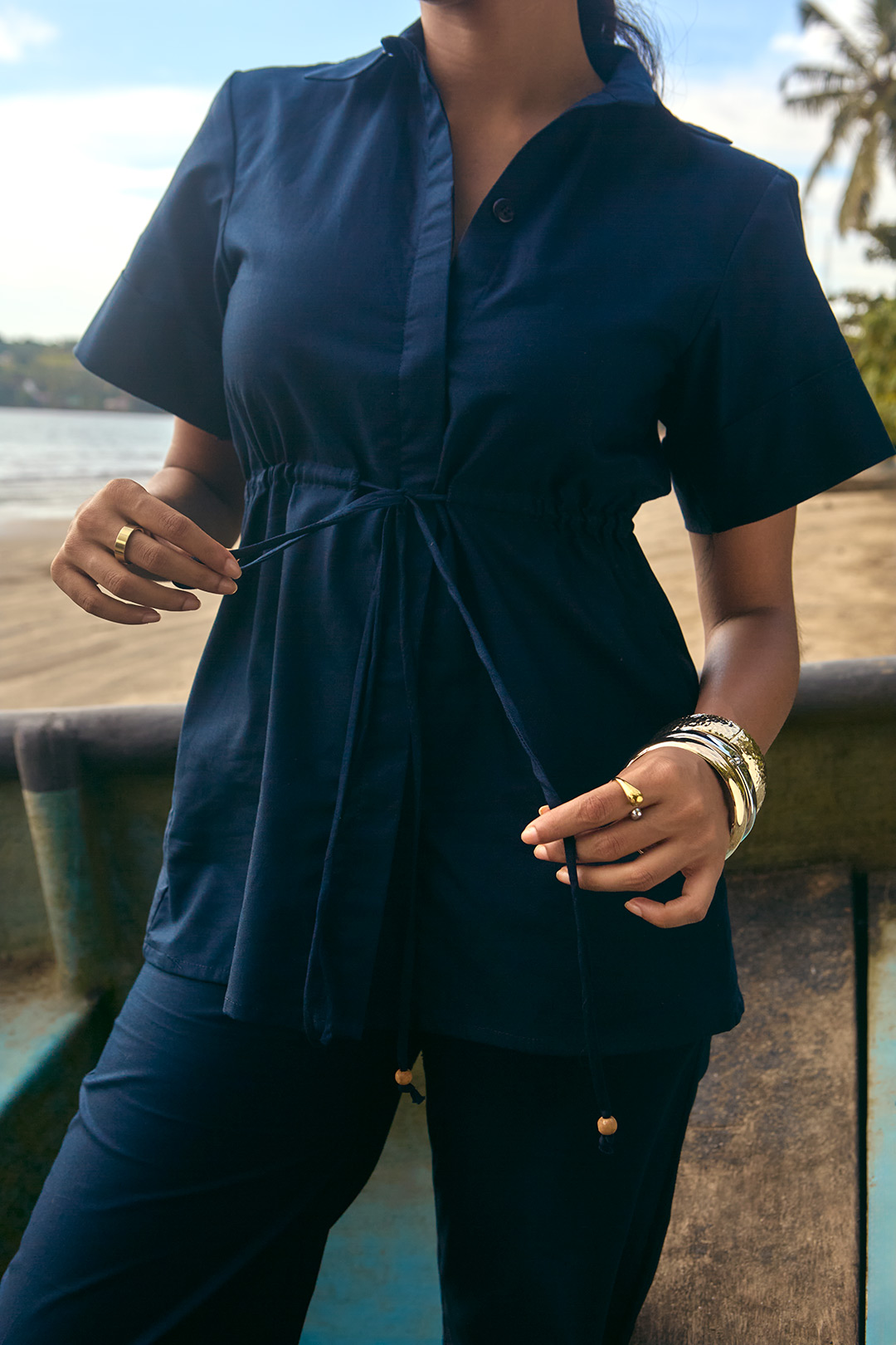Deep navy drill cotton twin set featuring a relaxed drawstring shirt with wood bead detailing and straight-leg trousers.