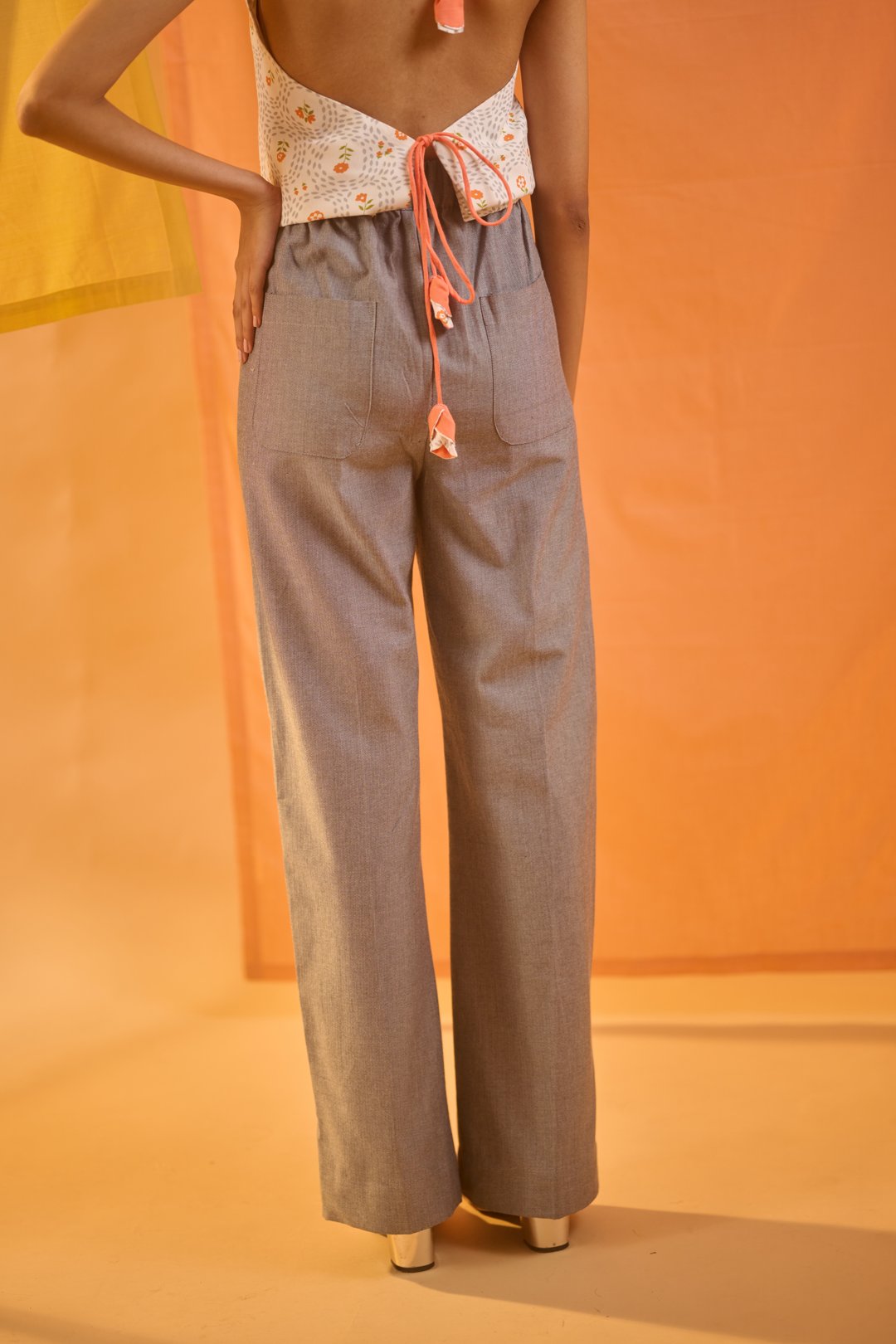 Grey self weave twill straight-leg trousers with front zip closure, and elastic waistband.