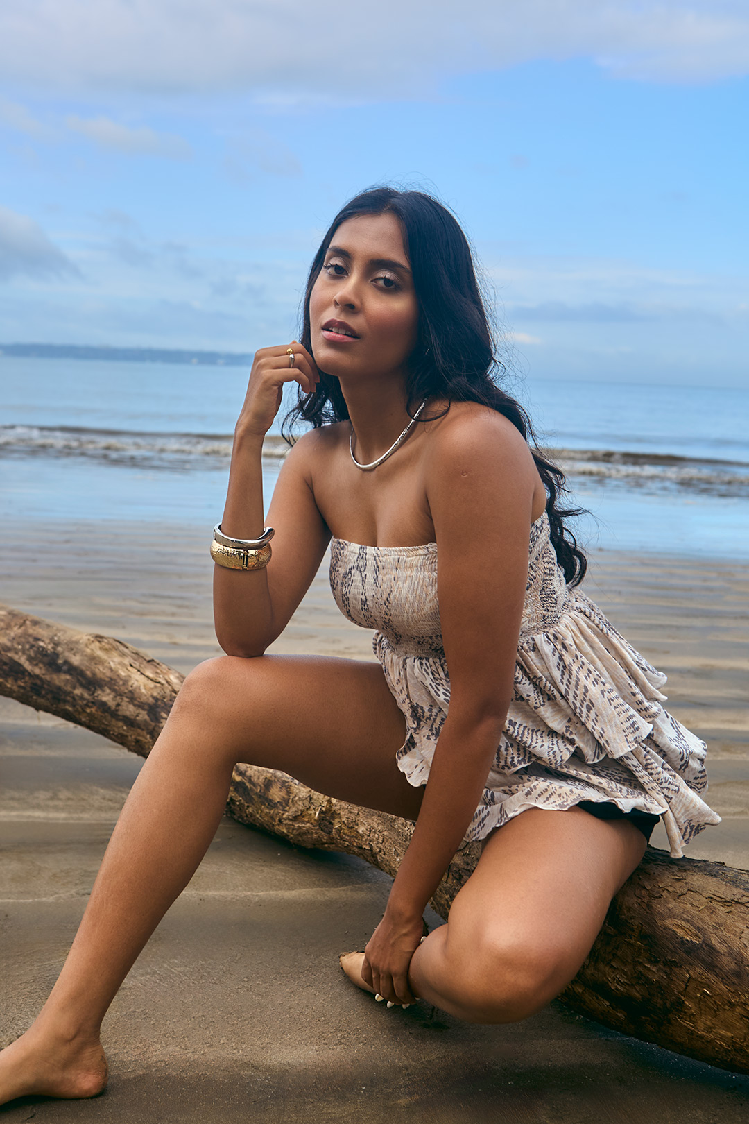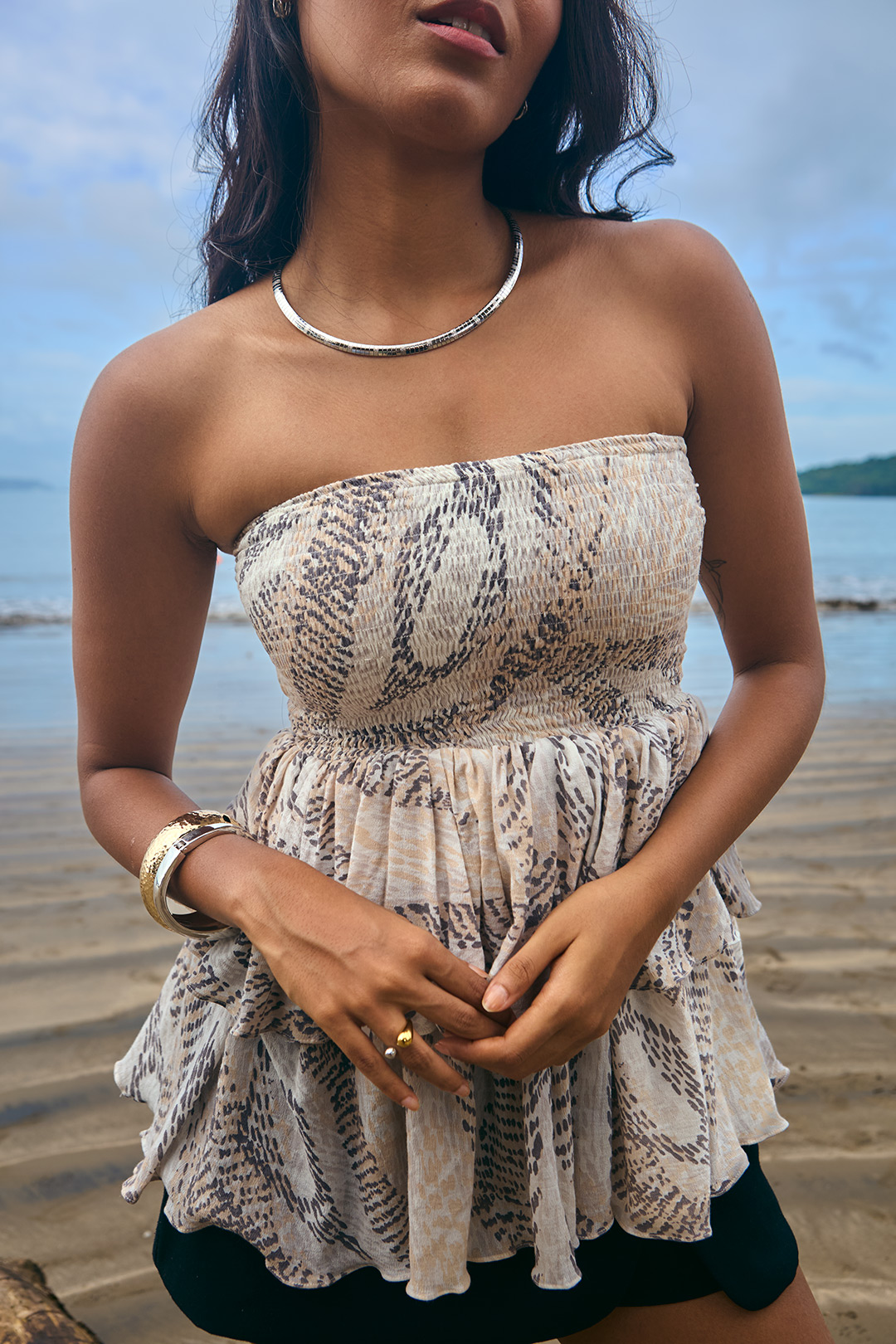 Printed beige crushed mulmul cotton tube top featuring cascading ruffles and a smocked bodice.