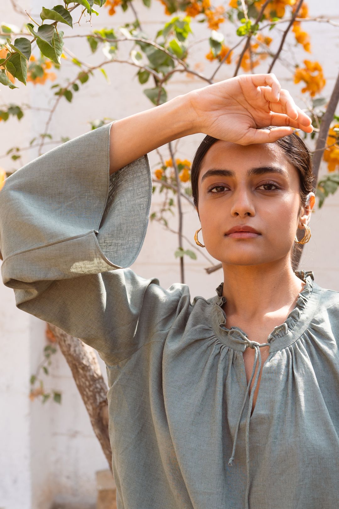 Neck Details: Closed neck with gathers and tie-up string