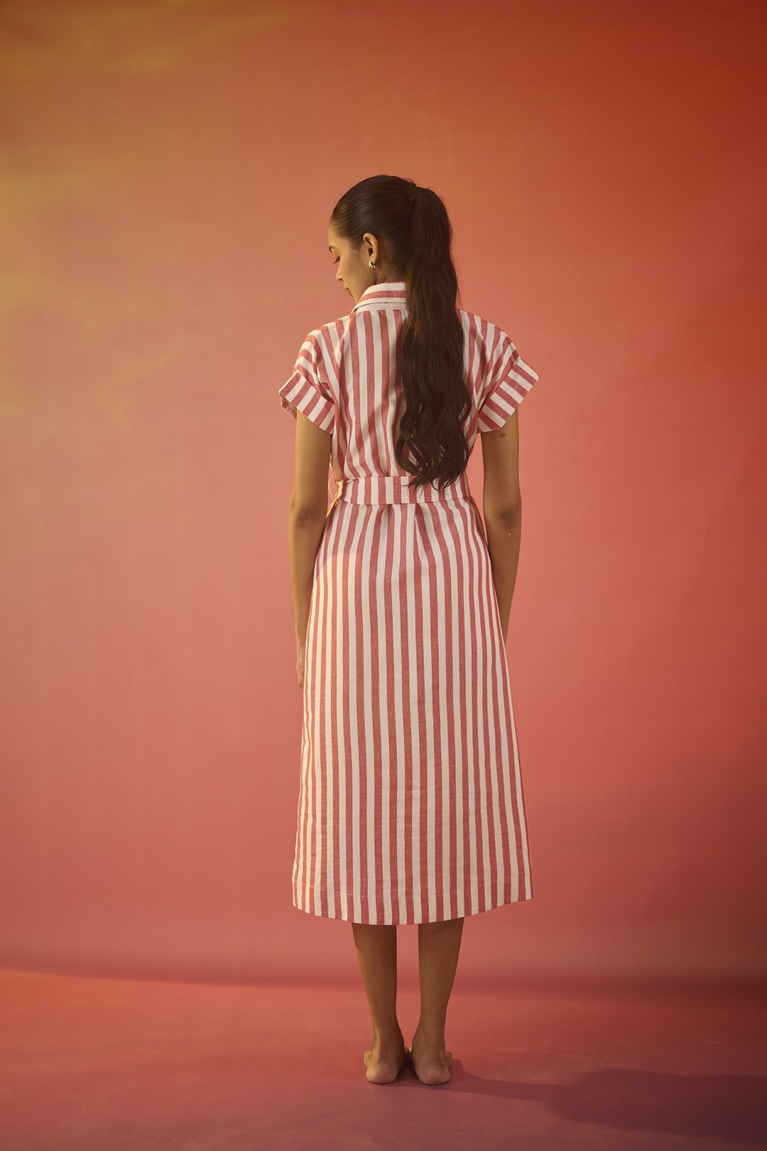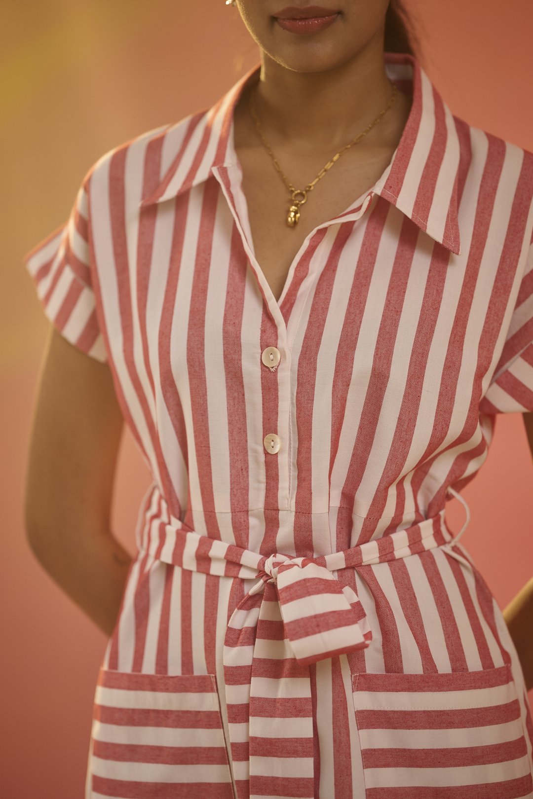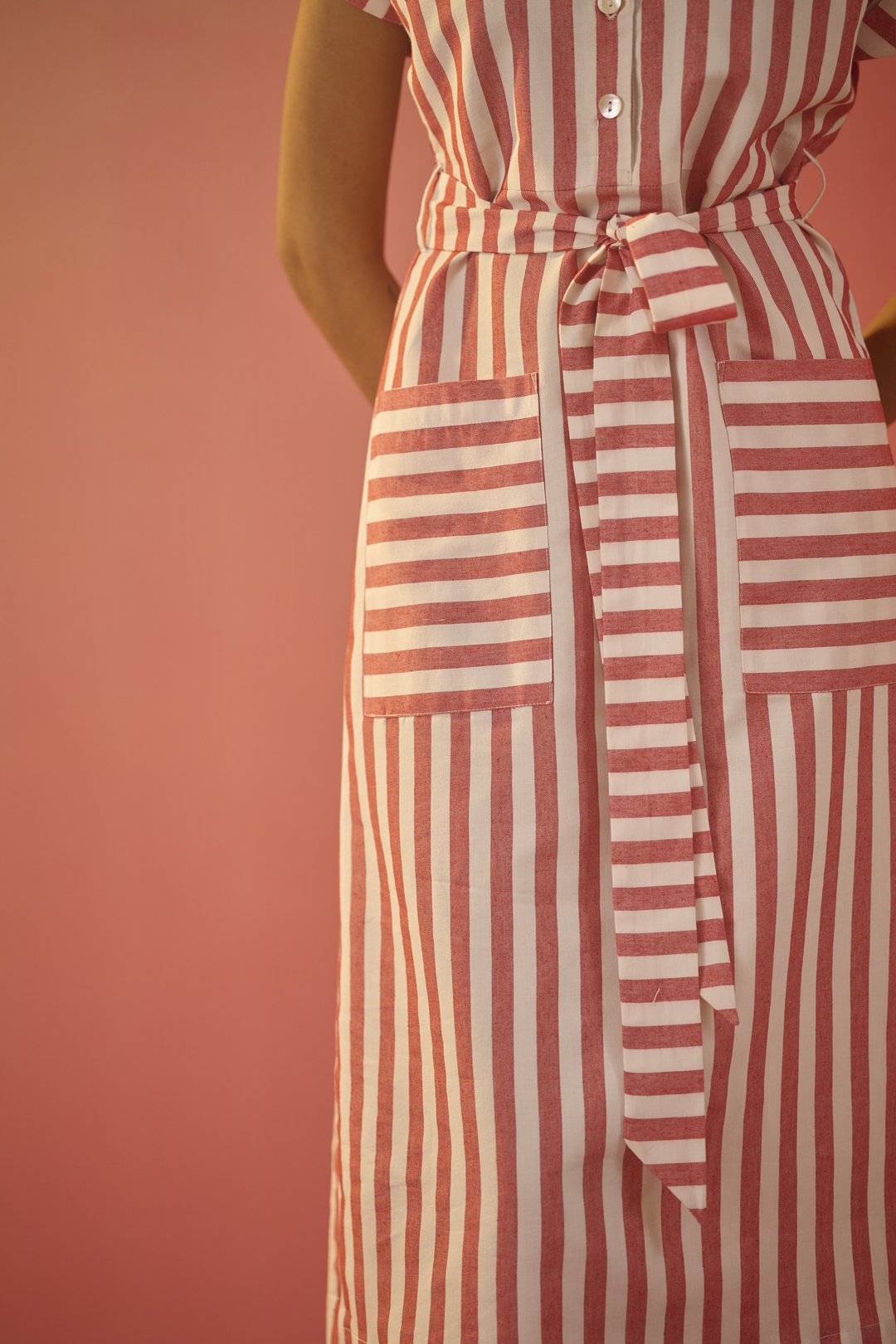 The Scarlet Horizon Midi Dress captures the essence of warm, carefree days. Featuring soft scarlet red and white stripes, this shirt-dress is designed with a refined collared neckline, cap sleeves, and a self-tie belt that gently defines the waist. Its flattering silhouette is perfect for any occasion, from coffee dates to elegant picnics or relaxed waterfront strolls. Need we mention the bonus pockets? They’re perfect for keeping your essentials handy.