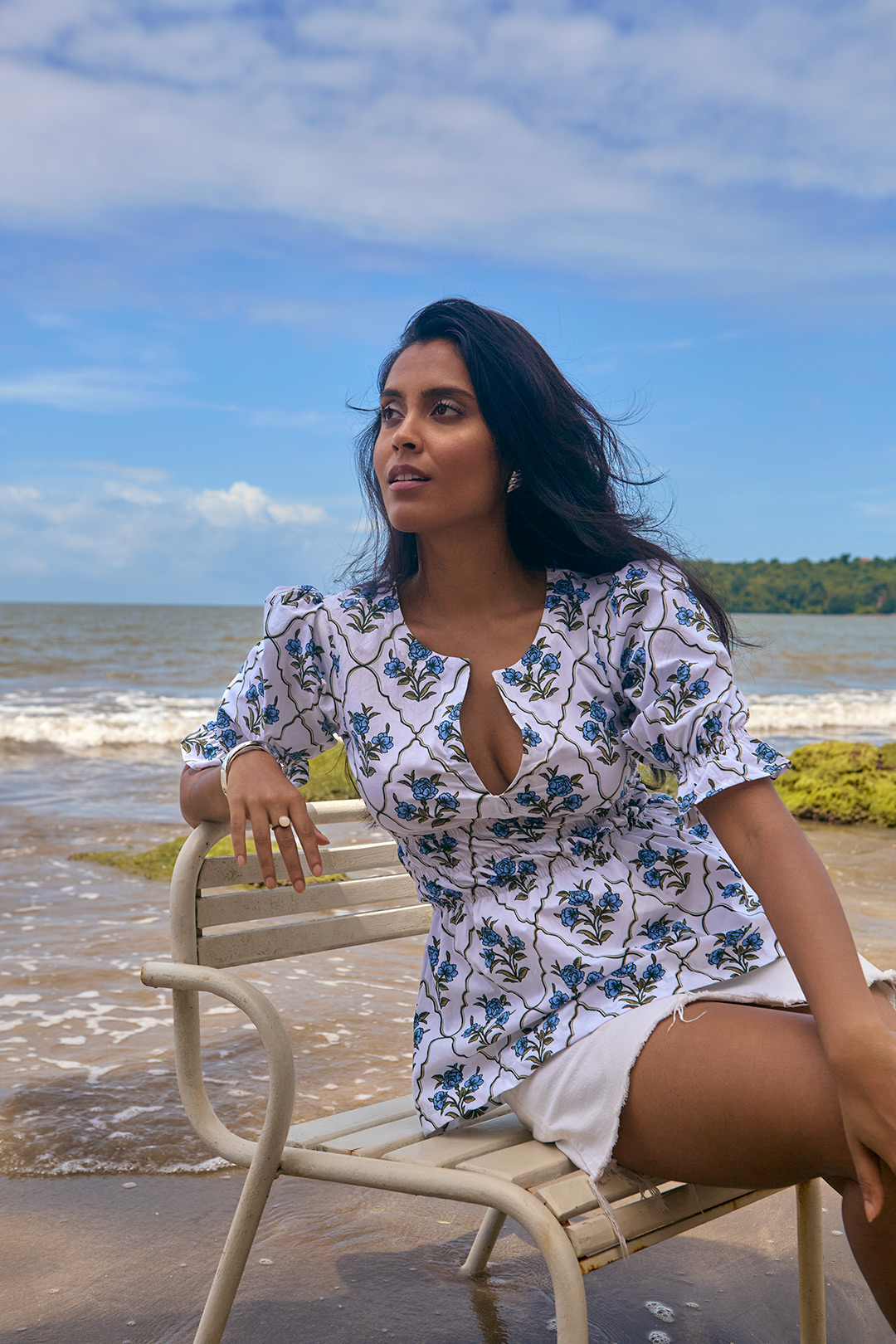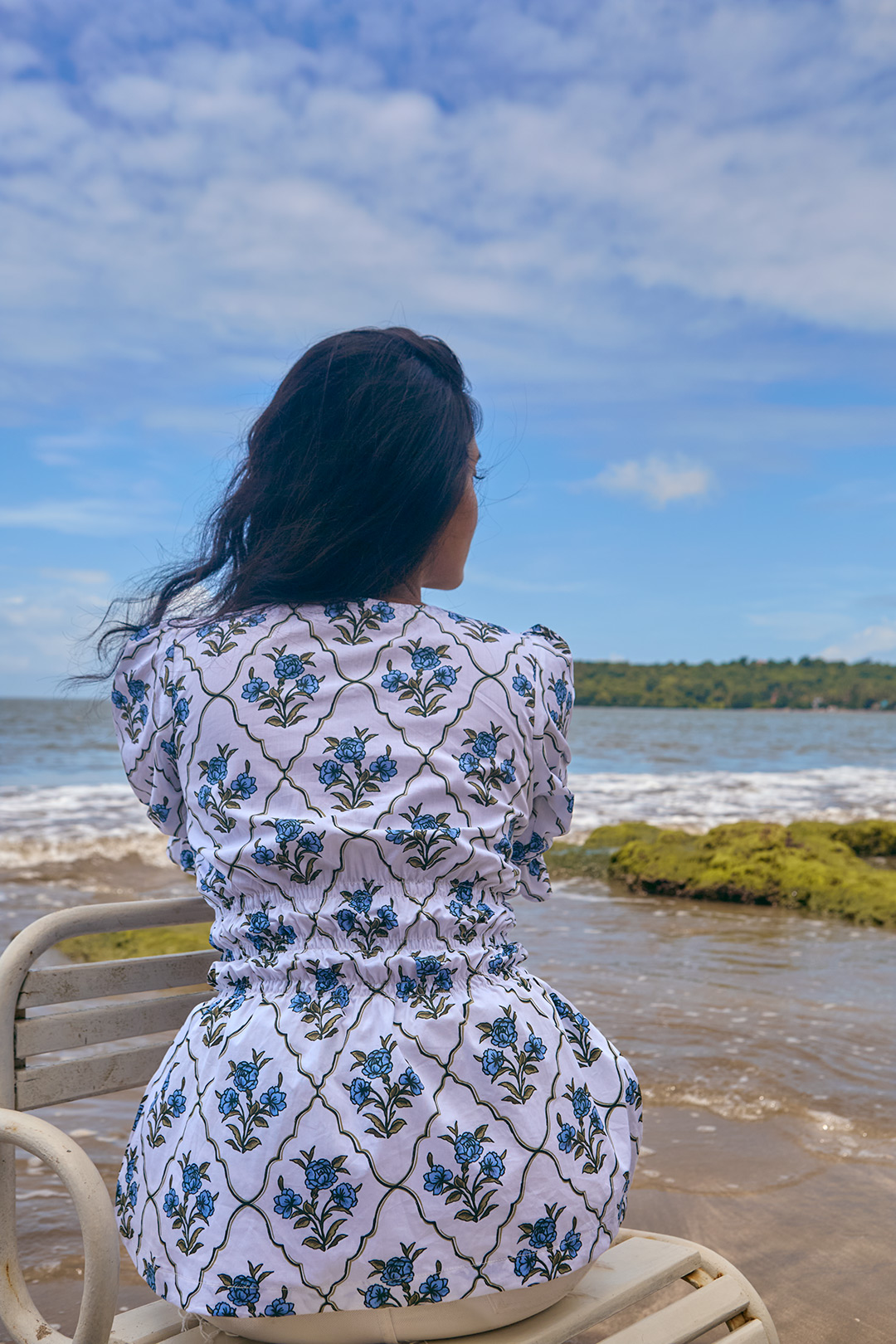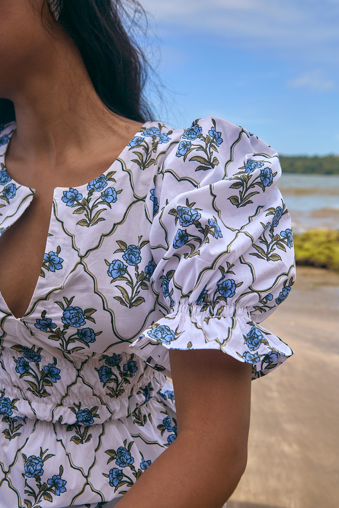 White cotton top with blue floral print, V-neckline, puffed sleeves, smocked waist, and peplum hem.