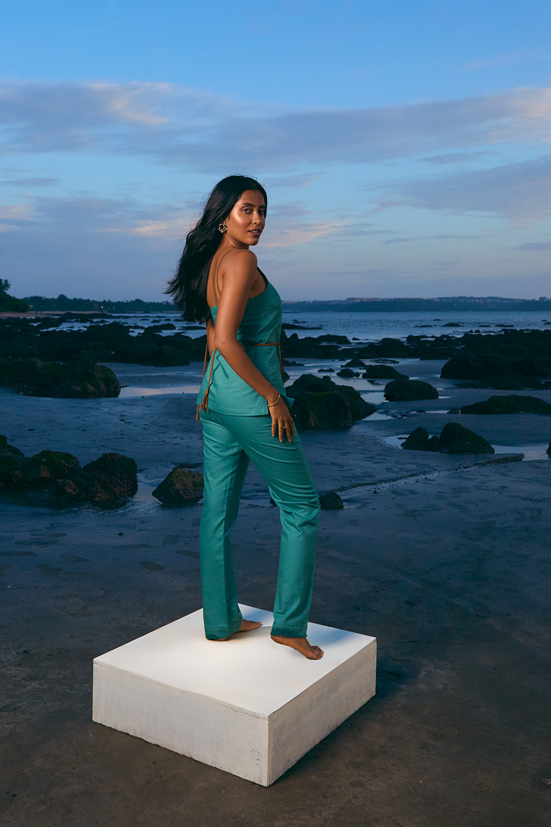Teal green oxford cotton twinset with suede strap top, tassel detail at the back, detachable tassel belt, elastic waistband straight-leg trousers with pocket.