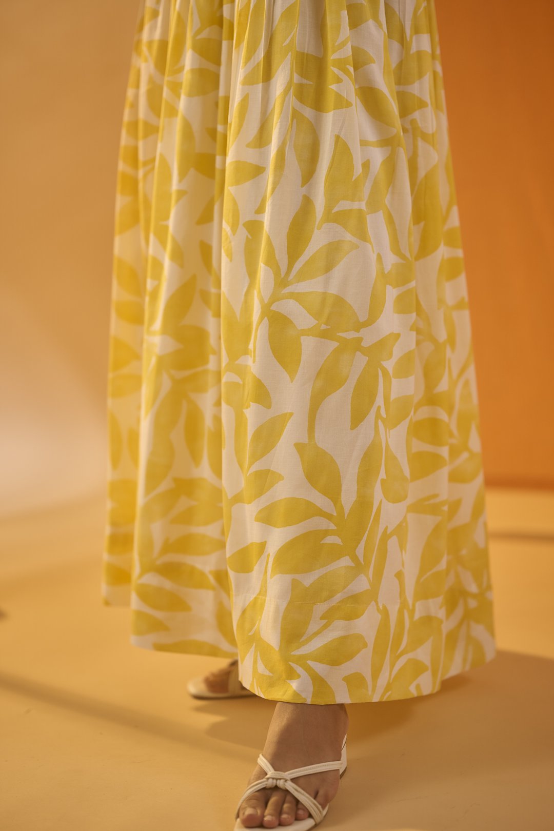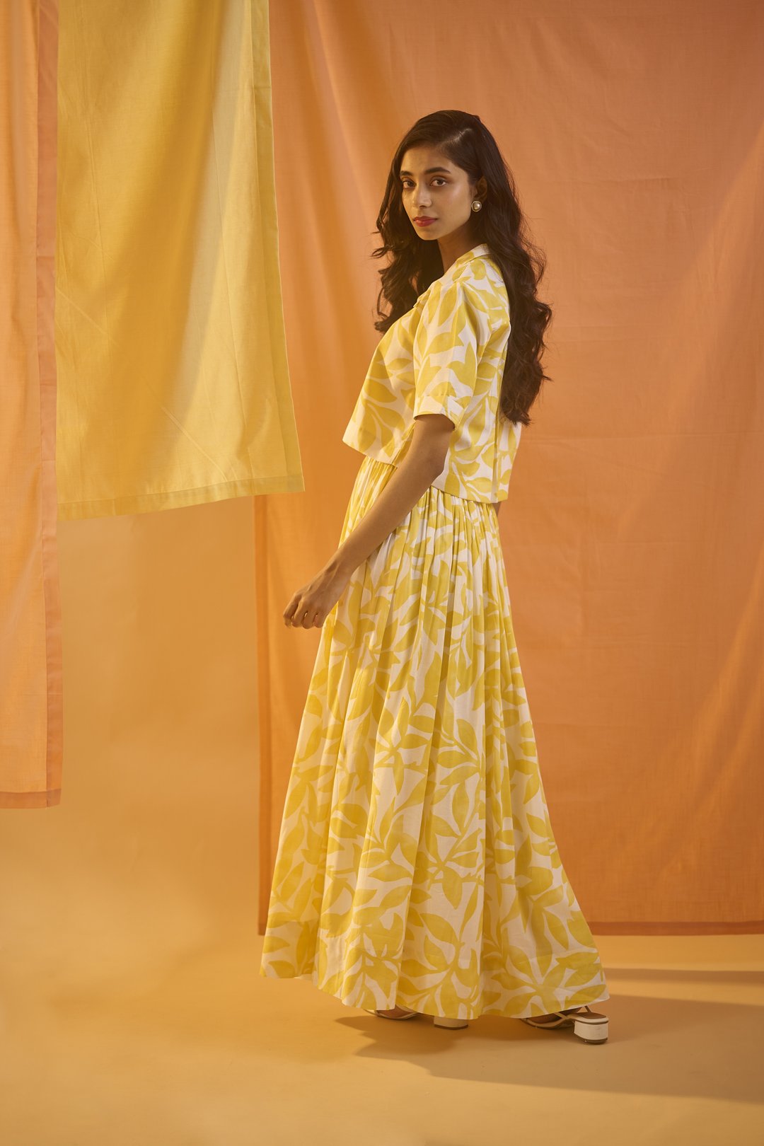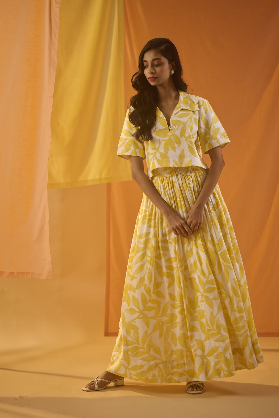 A yellow and white leaf print cotton twinset with a cropped collared shirt and a flowy maxi skirt.